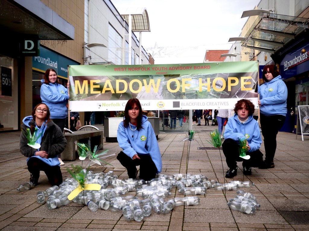 The ‘Meadow of Hope’ project has seen Blackfield Creatives and the YAB Young Commissioners work with other young people across West Norfolk to create an art installation, using recycled bottles to make hundreds of flowers which then formed a meadow. The purpose of the project is to raise awareness about the importance of protecting the environment, whilst highlighting the damage that single-use plastics and littering can cause.